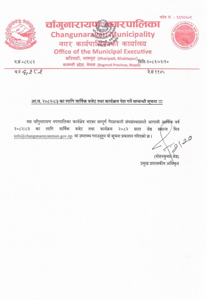 खरीपाटी : चाँगुनारायण नगरपालिकाले यही जेठ मसान्तसम्म आगामी आर्थिक वर्ष २०८२/०८३ को वार्षिक बजेट तथा कार्यक्रम पेश गर्न आह्वान गरेको छ ।