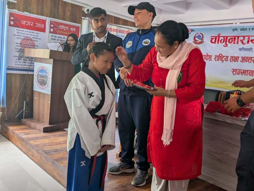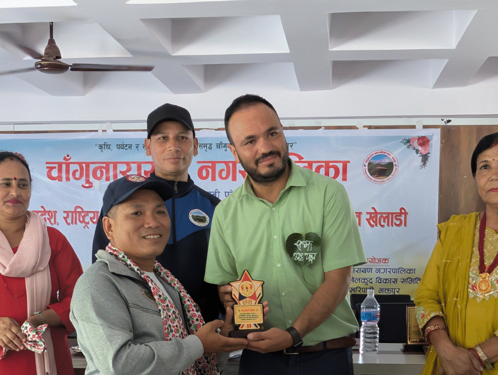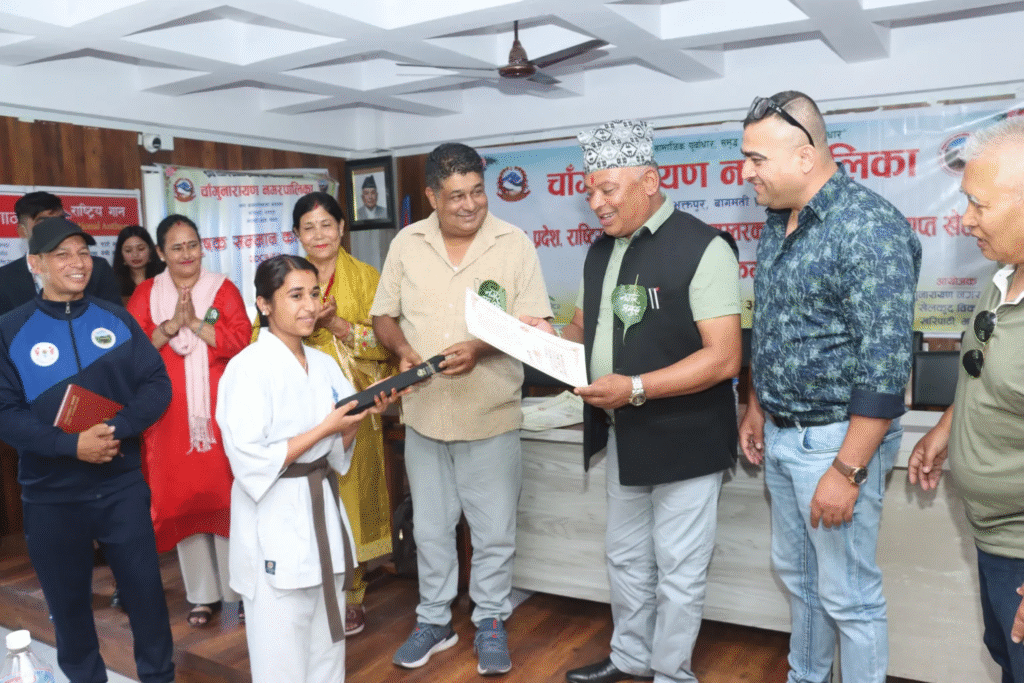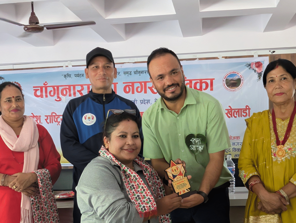 खरिपाटी : चाँगुनारायण नगरपालिकाले प्रोत्साहनस्वस्प खेलाडीहरुलाई सम्मान गरेको छ । नगर खेलकुद बिकास समितिको आयोजनामा बुधबार एक कार्यक्रमको आयोजना गरि खेलाडीहरुलाई सम्मान गरिएको हो ।