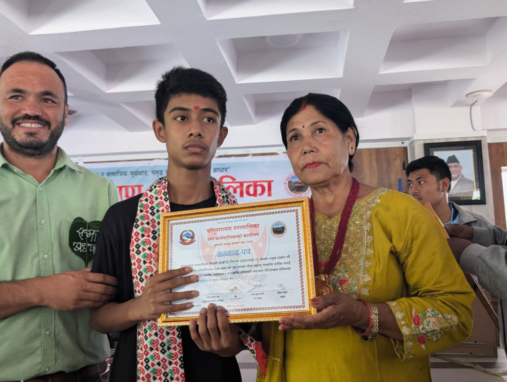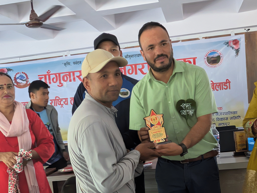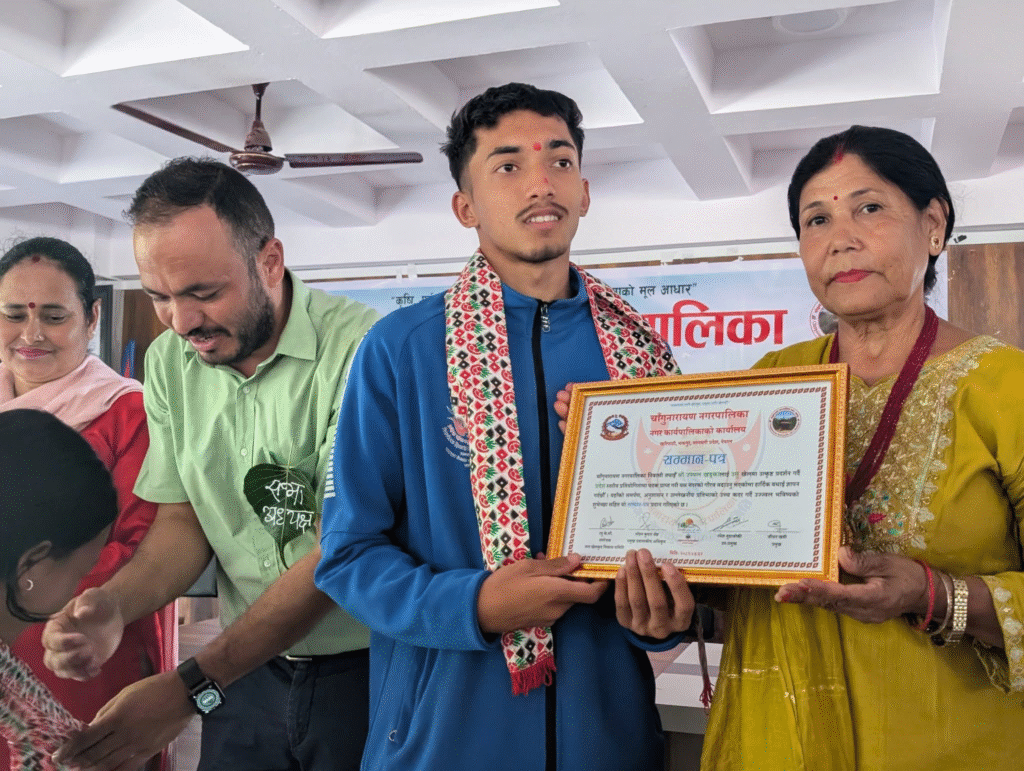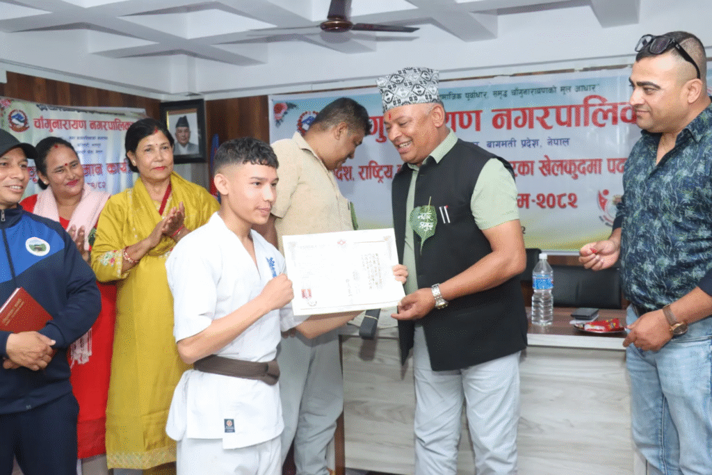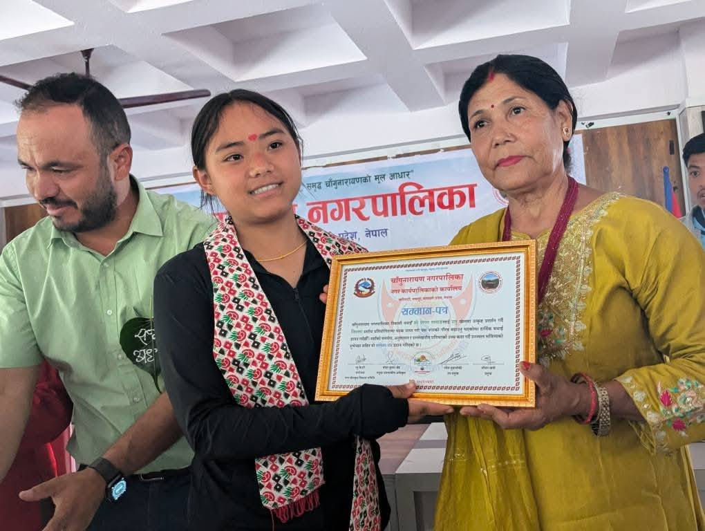 खरिपाटी : चाँगुनारायण नगरपालिकाले प्रोत्साहनस्वस्प खेलाडीहरुलाई सम्मान गरेको छ । नगर खेलकुद बिकास समितिको आयोजनामा बुधबार एक कार्यक्रमको आयोजना गरि खेलाडीहरुलाई सम्मान गरिएको हो ।