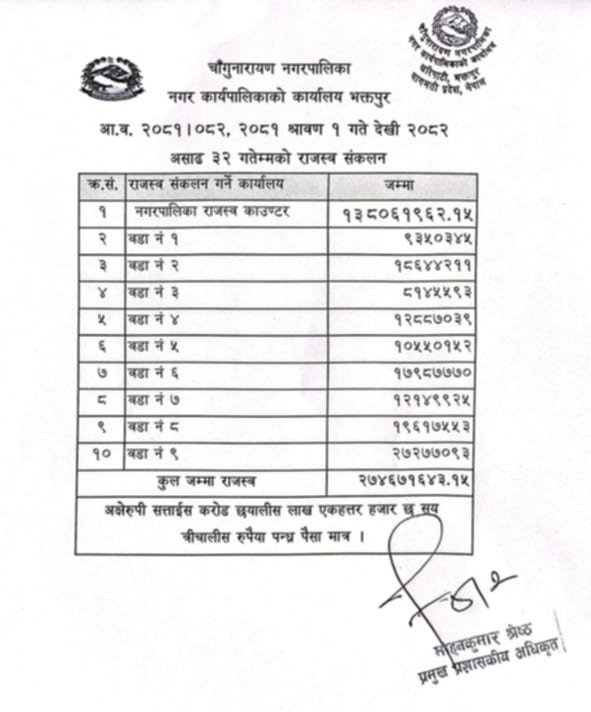 प्रमुख प्रशासकीय अधिकृत मोहन कुमार श्रेष्ठका अनुसार नगरपालिकाको राजस्व संकलन गर्ने काउन्टरबाट साउनदेखि असार मसान्तसम्म १३ करोड ८० लाख ६१ हजार ९६२ र अन्य रकम वडाबाट संकलन गरिएको हो ।
