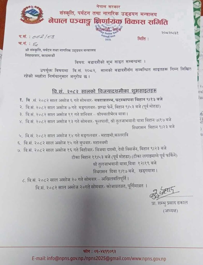 काठमाडौँ । नेपाल पञ्चाङ्ग निर्णायक विकास समितिले यस वर्षको दसैँका विभिन्न साइत सार्वजनिक गरेको छ । समितिका समितिका अध्यक्ष प्रा.शम्भु प्रसाद ढकालले असोज ६ गते सोमबार बिहान ९:१३ बजे घटस्थापनाको साइत रहेको जानकारी दिनुभयो । त्यस्तै असोज १६ गते बिहीबार ११:५३ बजे टिकाको साइत रहेको छ ।