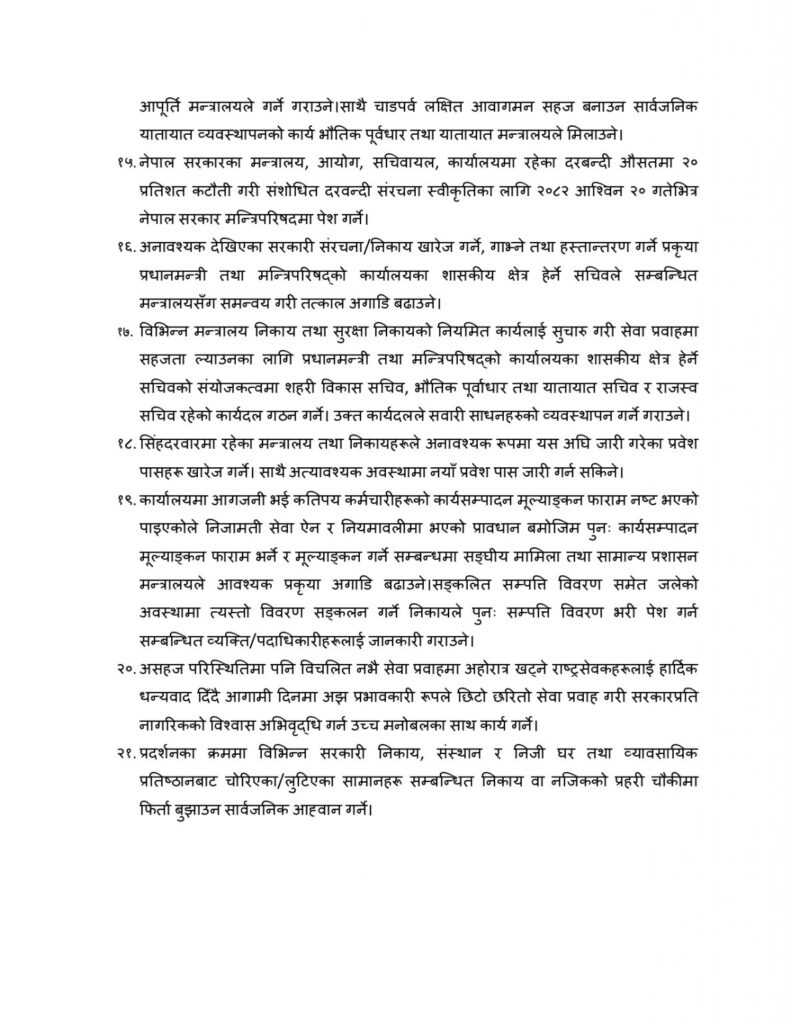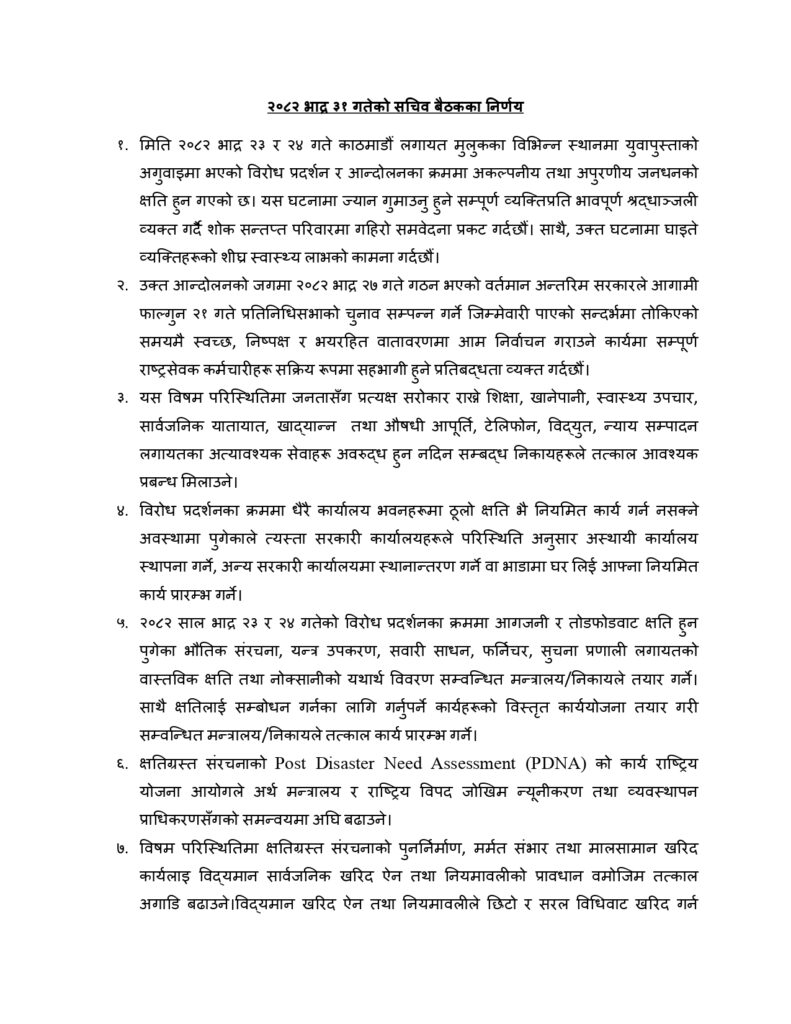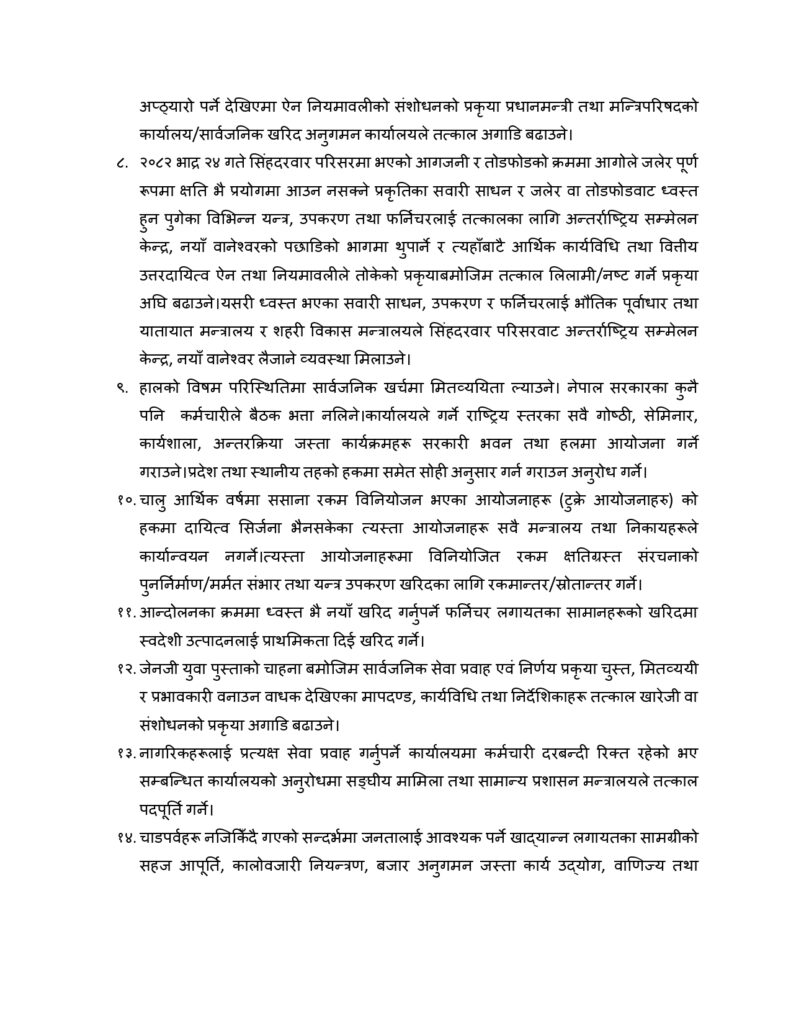 चाडपर्व नजिकिँदै गर्दा खाद्यान्न आपूर्ति सुनिश्चित गर्न, कालोबजारी नियन्त्रण गर्न र यातायात व्यवस्थापन सुदृढ बनाउन सम्बन्धित मन्त्रालयहरूलाई निर्देशन दिइएको छ। आन्दोलनका क्रममा नष्ट भएका मूल्याङ्कन फाराम र सम्पत्ति विवरण पुनः संकलन प्रक्रिया सुरु गरिनेछ।