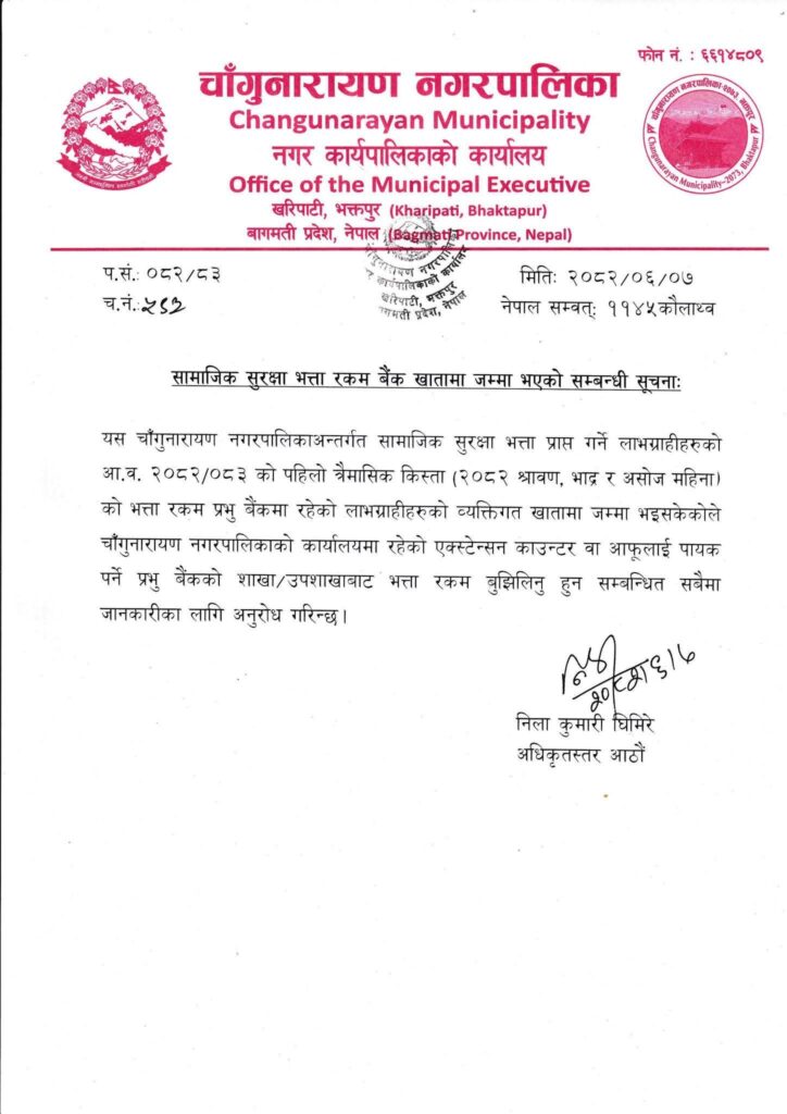 चाँगुनारायण (खरीपाटी) – चाँगुनारायण नगरपालिकाले आफ्नो क्षेत्रभित्रका सामाजिक सुरक्षा भत्ता पाउने लाभग्राहीहरूको भत्ता खातामा जम्मा गरिएको जनाएको छ । नगरपालिकाको कार्यालयबाट जारी सूचनामा आर्थिक वर्ष २०८२/०८३ को पहिलो त्रैमासिक किस्ता (श्रावण, भदौ, असोज.) को सामाजिक सुरक्षा भत्ता लाभग्राहीको बैंक खातामा जम्मा भइसकेको जानकारी गराइएको हो।