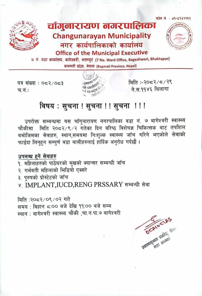 बिहान ८ बजेदेखि ११ बजेसम्म सञ्चालन हुने शिविर बागेश्वरी स्वास्थ्य चौकीमै आयोजना हुने भएकाले सेवा लिन इच्छुक सम्पूर्ण वडा बासी तथा स्थानीय समुदायलाई उपस्थित भई लाभ लिन नगरपालिकाले आग्रह गरेको छ।