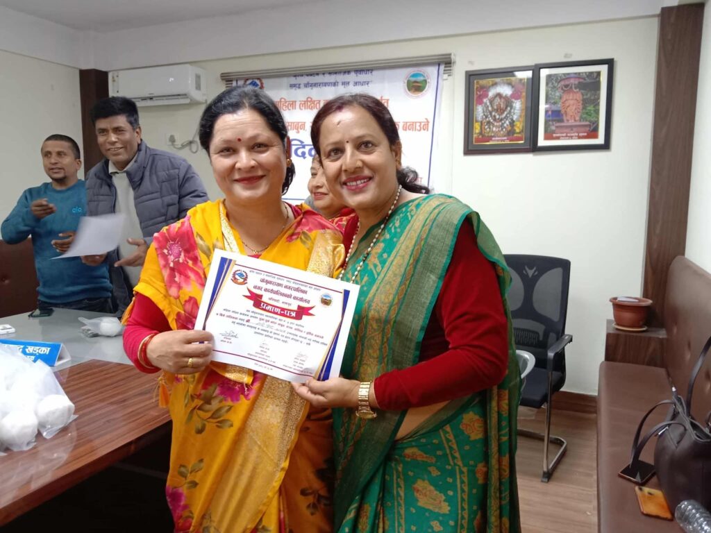 यस कार्यक्रमलाई सफल बनाउन विशेष भूमिका निर्वाह गर्नुहुने निर्मला के.सी. तथा सक्रियतापूर्वक सहभागिता जनाउने सम्पूर्ण प्रशिक्षार्थी महिलाहरूको योगदान प्रशंसनीय रहेको छ।