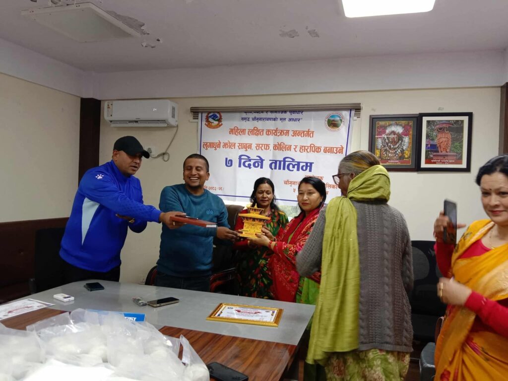 छालिङ, पौष ४: चाँगुनारायण नगरपालिका वडा नं. ५, छालिङ भक्तपुरमा सञ्चालित “महिला लक्षित कार्यक्रम” अन्तर्गत विभिन्न किसिमका सरसफाइ सामग्री उत्पादन सम्बन्धी ७ दिने तालिम कार्यक्रम सफलतापूर्वक सम्पन्न भएको छ।